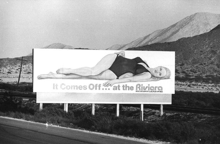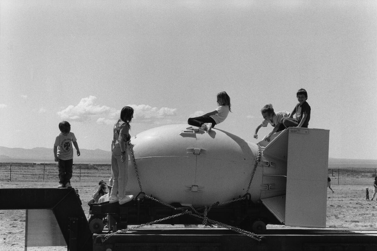 On the way to Palm Springs, he captured a coquettish advertisement in the middle of the desert, while in New Mexico, children play on a replica of “Fat Man,” the atomic bomb dropped on Nagasaki.