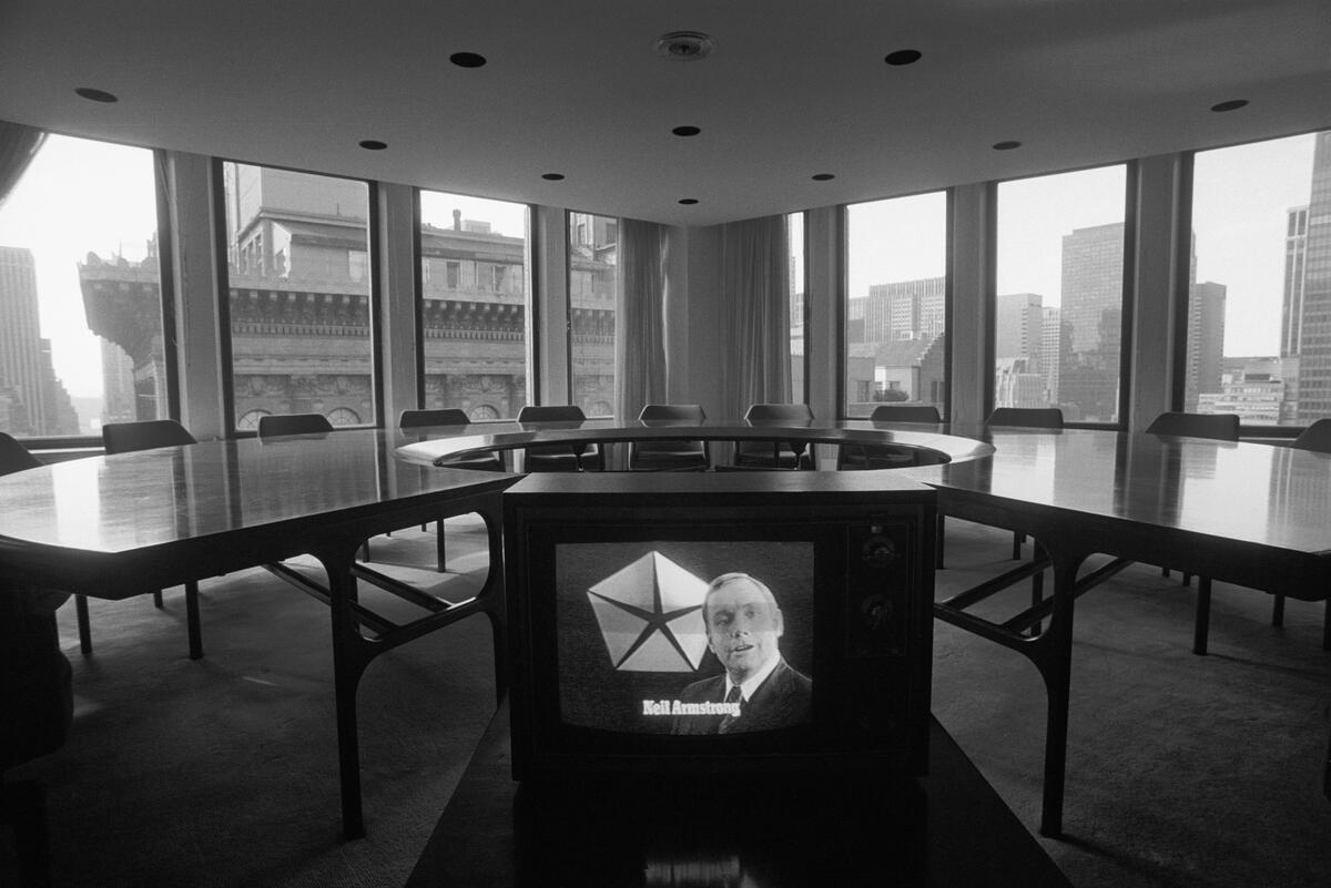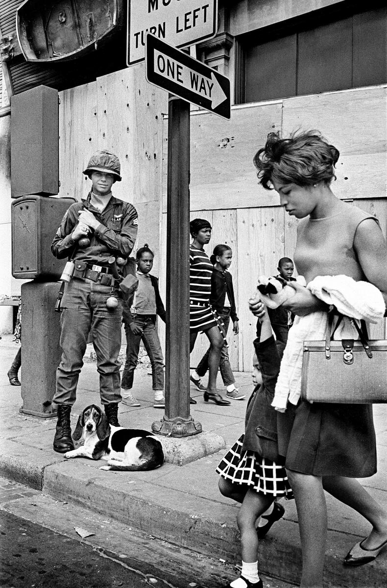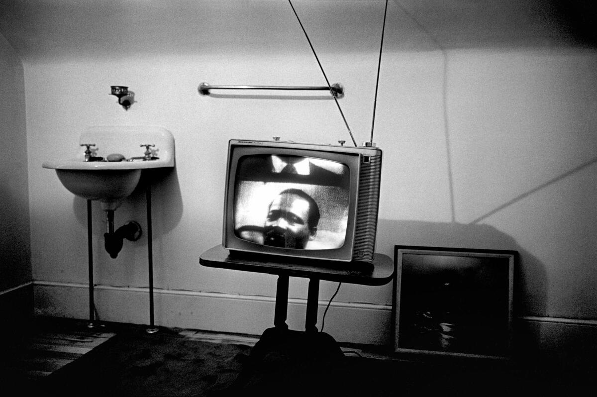 Two years after photographing Fort Lauderdale, Burri captured the civil rights movement from his own perspective, offering surprising depictions of the country’s unease: the casual smile of a young soldier in Washington, D.C. and Martin Luther King Jr. speaking on television the year he was assassinated. In the latter photograph, the room is lifeless, with King’s image split on the screen, evoking both a literal and social disconnect.