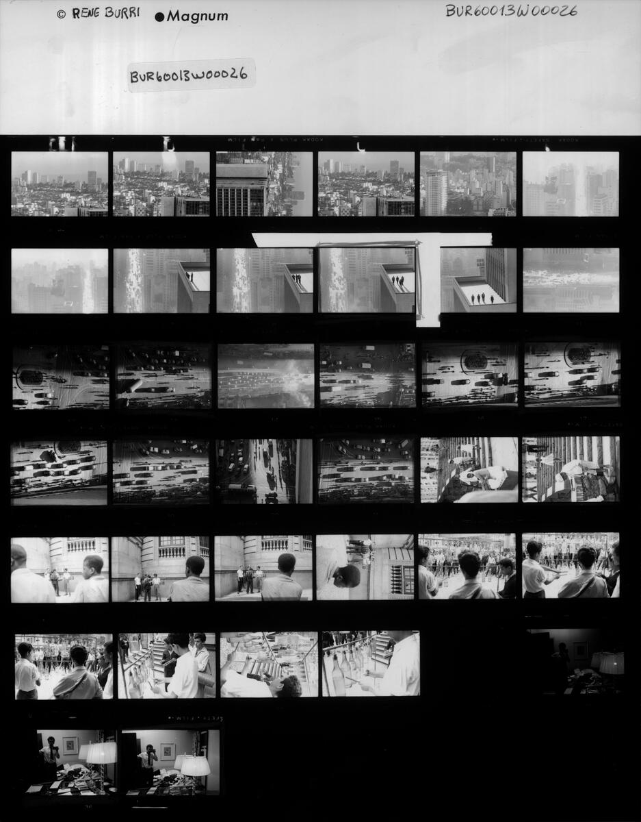 In 1960, René Burri found his way to the top of a sunlit skyscraper along Avenida Paulista, a bustling financial hub in the west of São Paolo, Brazil’s most populated city. He was there on assignment for the German magazine Praline, who had asked him to report on the city and the industrialization of the countryside. The photograph he took from the heights of the southern metropolis became one of Burri’s most recognizable images of his career, coming to represent industry versus human, agency versus precarity.