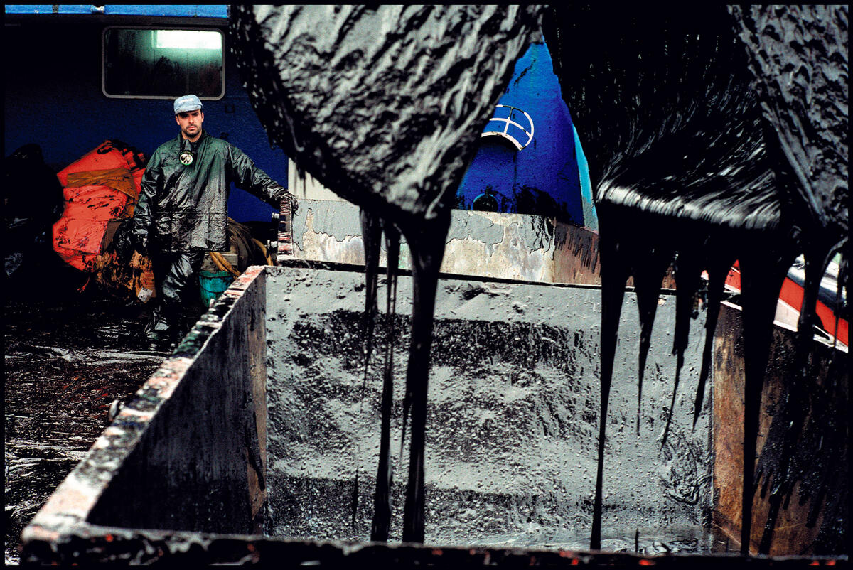 their boats day after day to help clear the seas and prevent further damage to the once pristine beaches. Aguino, Galicia, Spain. 2002. © Ian Berry / Magnum Photos