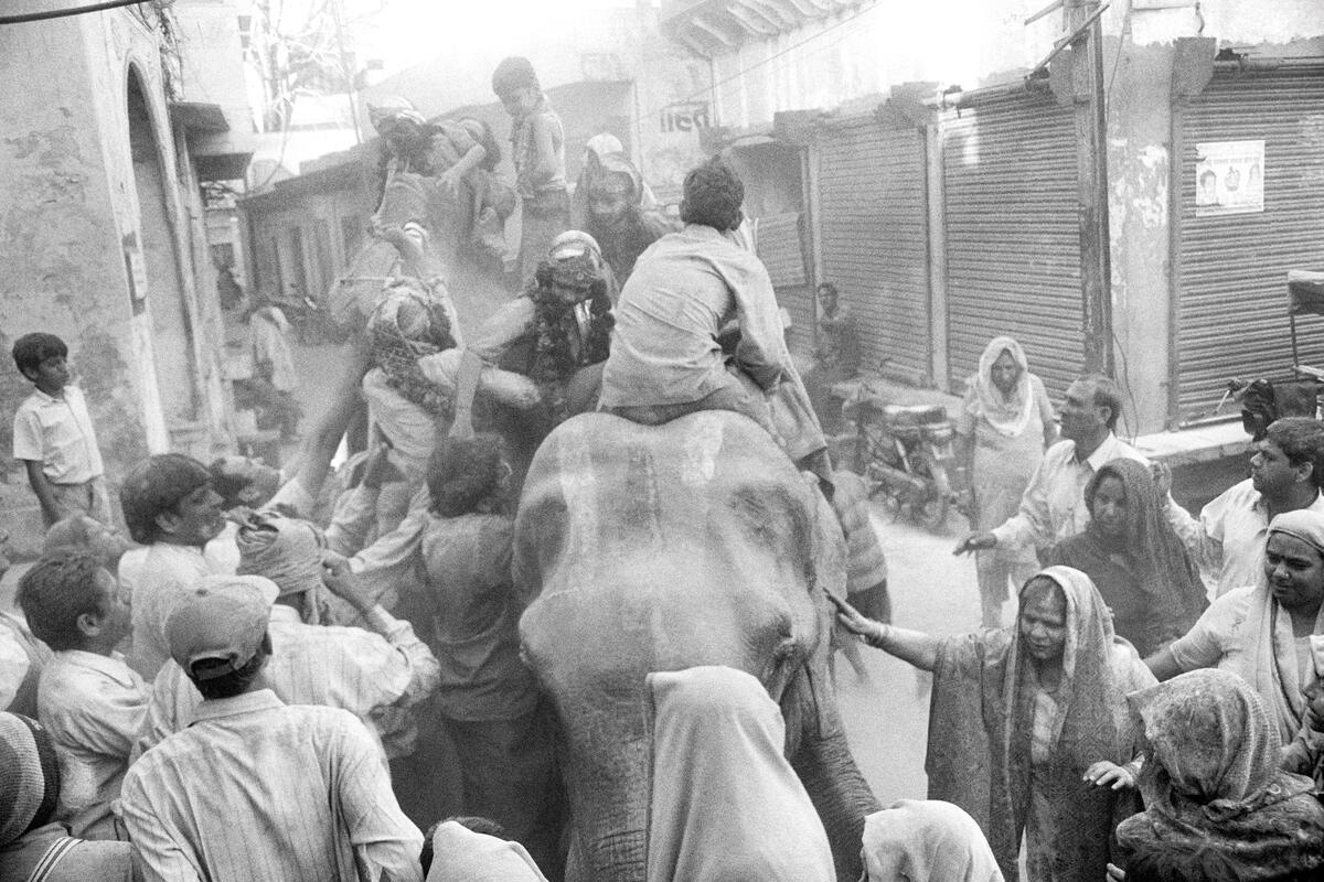 “I had arrived in Vrindavan only a day before and had been walking around in what seemed to be an empty part of the city during the time of Holi, when all of a sudden an elephant, children atop it dressed as mythological characters, and throngs of people from every direction, came together and then disappeared almost as quickly.”