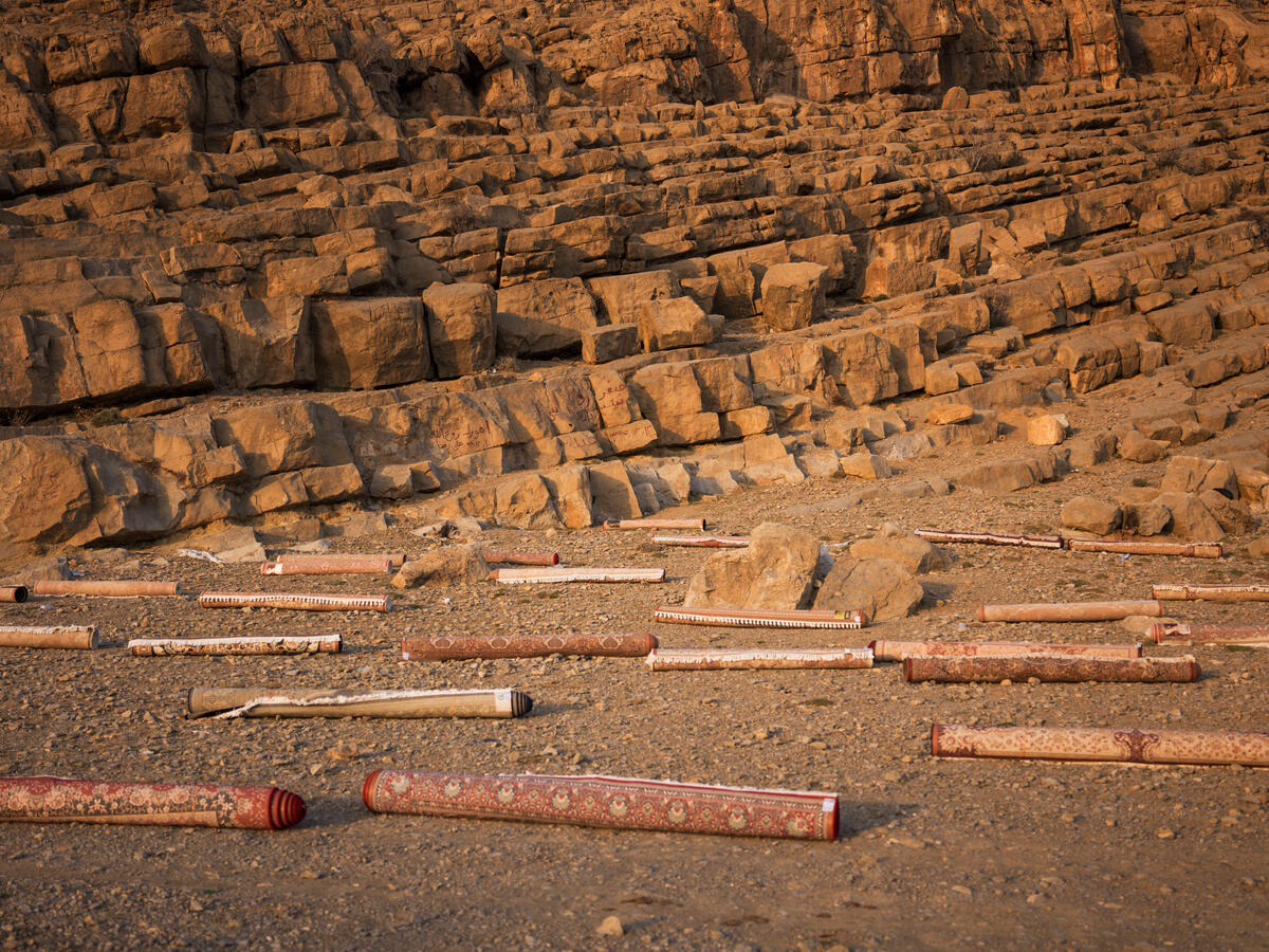 “A series of carpets laid out to dry after having been washed by professional carpet cleaners, near the royal graves of Naqsh-e Rostam that are carved out in the mountains. They are washing the tapestries for the coming Iranian New Year, which coincides with the spring equinox, usually on March 21st.”