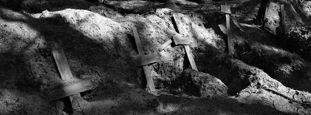 A mass burial site in Izium. The Russian seized Izium in April 2022. When Ukrainian soldiers liberated it in September, they discovered the graves of more than 400 citizens. Ukraine. June 2023.