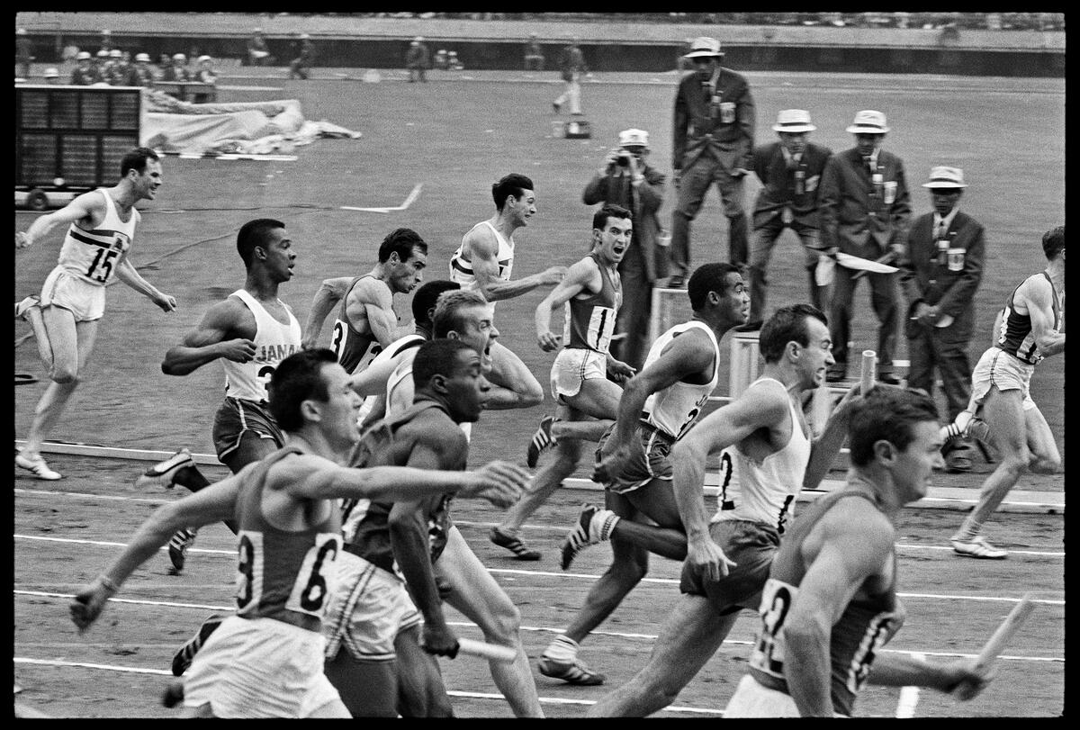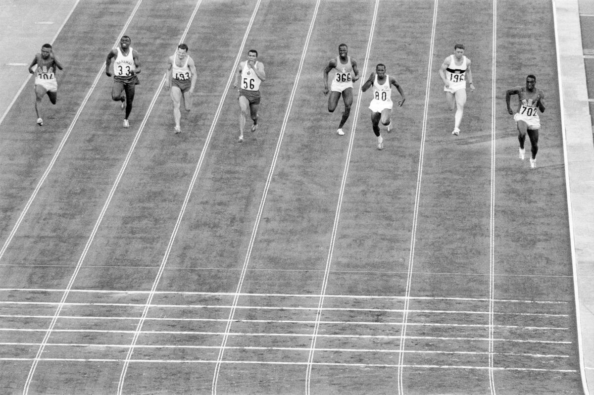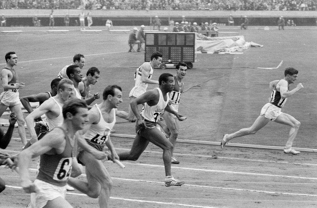 Final of the 4 x 100m relay. French athlete Claude Piquemal has just given the baton to Jocelyn Delecour with a 3m lead over the Americans. But the American athlete Bob Hayes would overturn the sit (...)