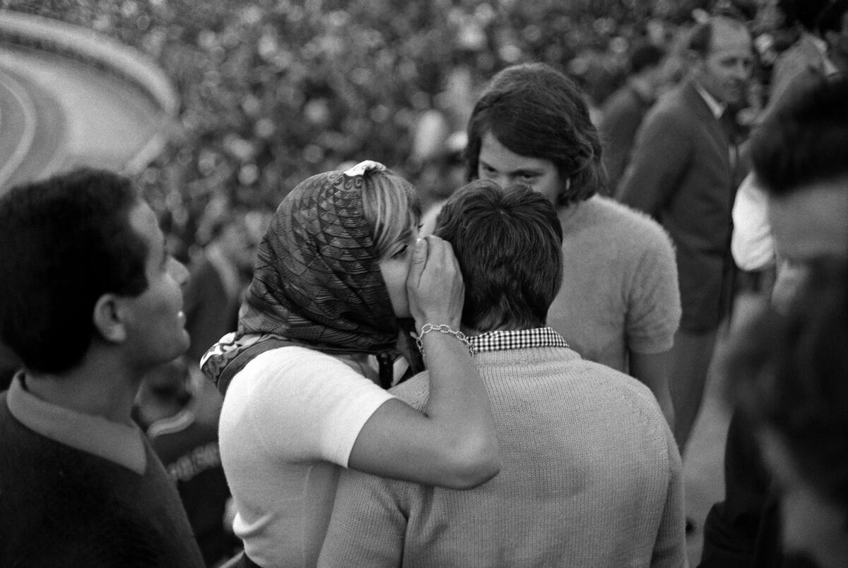 French swimmer Christine Caron (left) and the skier Marielle Goitschel (right) in the stands to cheer the French middle distance runner Michel Jazy. Tokyo, Japan. 1964.