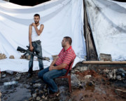 Two Sunni militiamen during the aftermath of a bomb by the Al-Taqwa Mosque. Tripoli, Lebanon. August, 2013.