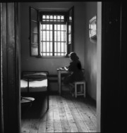 A prison for juvenile delinquents. A young prostitute in her cell. The sign on her cell door says, "Venereal disease - contagious". Vienna, Austria. 1948.