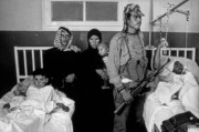Palestinian family visits their wounded son while a P.F.L.P. stands guard. Amman, Jordan. 1970.