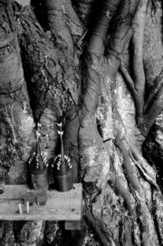 Candles, alcoholic drink and flowers stuck in banana leaves are offered on an altar by a tree to appease spirits. Vientiane, Laos. 2008.