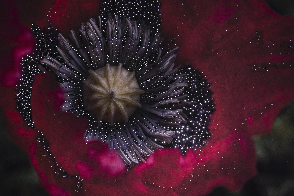 the cosmos in the flower Poppy flower. The opium gum extracted from the poppy flower is transformed into heroin in Mexico and almost entirely exported to the United States and Canada. Intervened photography. Guerrero, Mexi